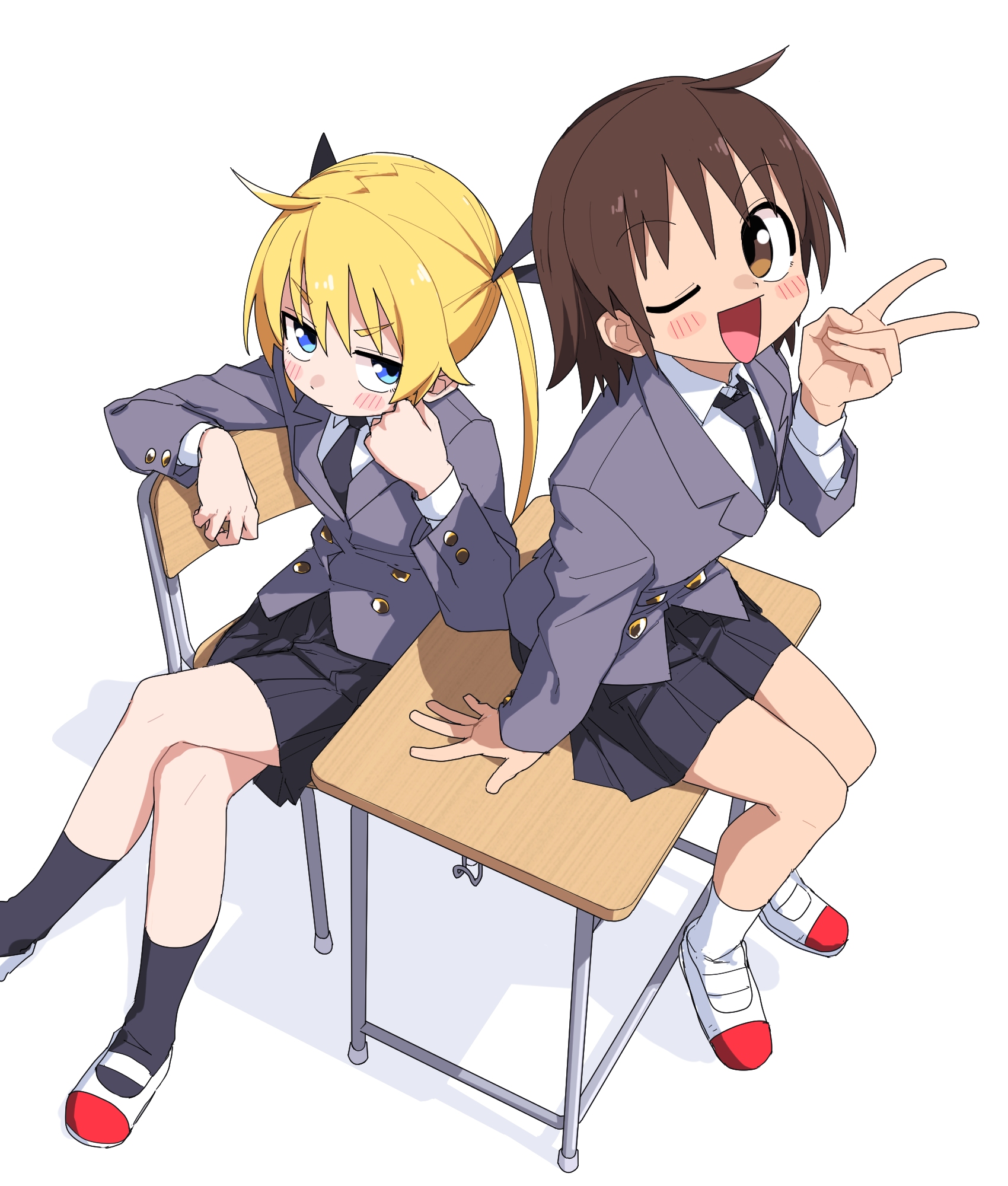 2girlsblack necktieblack ribbonblack skirtblack socksblonde hairblue eyesbrown eyesbrown hairchaircrossed legsdeskhair ribbonlong hairlong sleeveslooking at viewermultiple girlsnecktieone eye closedopen mouthribbonschool chairschool deskschool uniformshoesshort hairsimple backgroundsittingskirtsockstonguetwintailswhite backgroundwhite socks