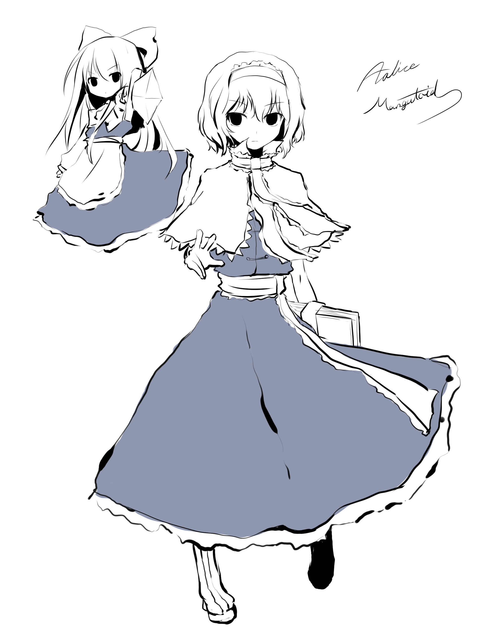 1girlblue themebookcapeletfemale focushairbandmonochromeribbonshort hairskirtsolospot colorswordweaponwhite background