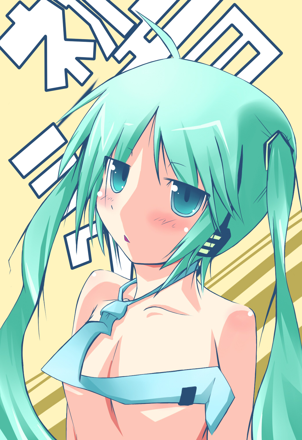 1girlaqua eyesaqua hairblushcensoredconvenient censoringfemale focusheadphoneslong hairnecktiesolotopless femaletwintailsvery long hair