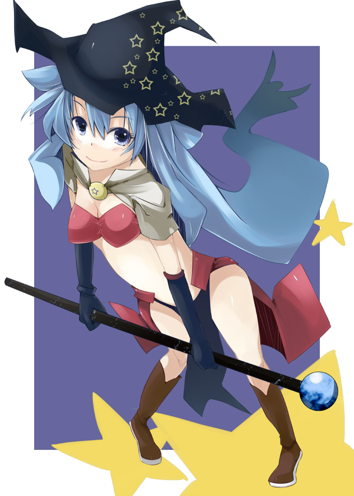 1girlbikinibikini top onlyblack glovesblack hatblue eyesblue hairblushbootsbreastsbrown bootscleavageclosed mouthelbow glovesfull bodygloveshatholdingholding stafflong hairlooking at viewermedium breastsmidriffpelvic curtainpurple backgroundred bikinired skirtshowgirl skirtskirtsmilesolostaffstandingstar (symbol)star printswimsuitwitch hat