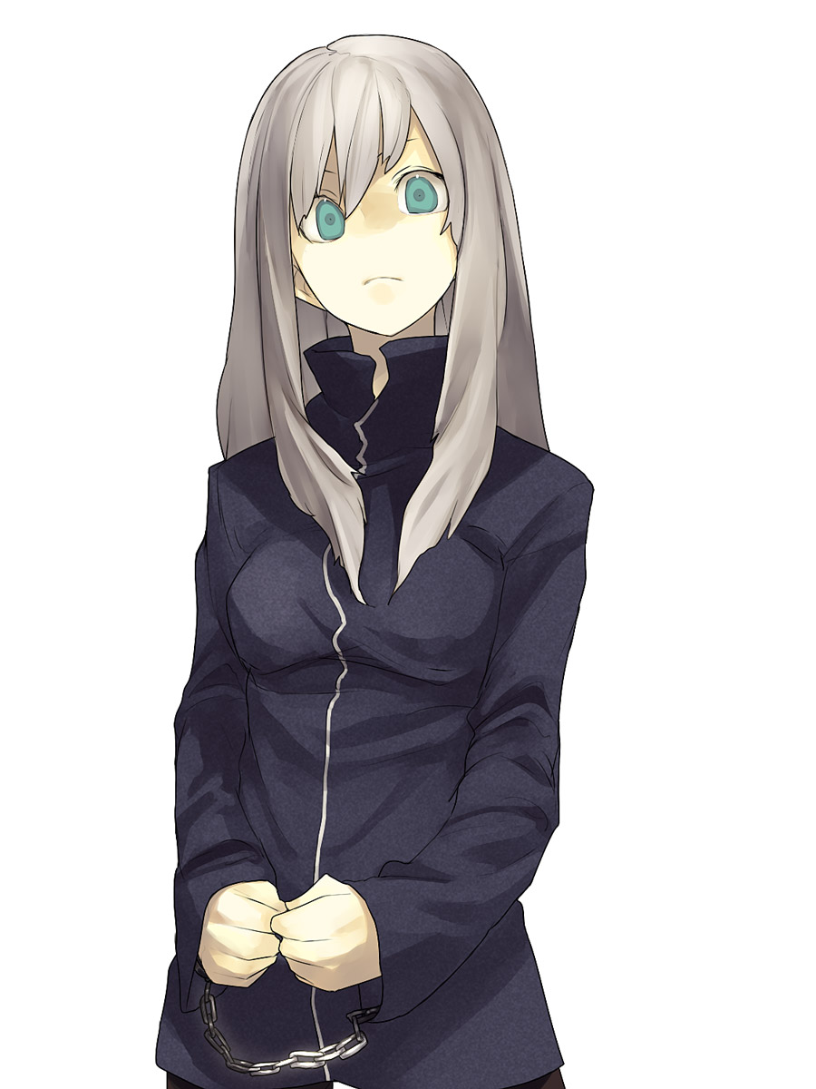 1girlbreastschaincuffsfemale focusgreen eyeshair between eyeshandcuffsjacketlong sleeveslooking at viewershort hairsimple backgroundsolowhite background
