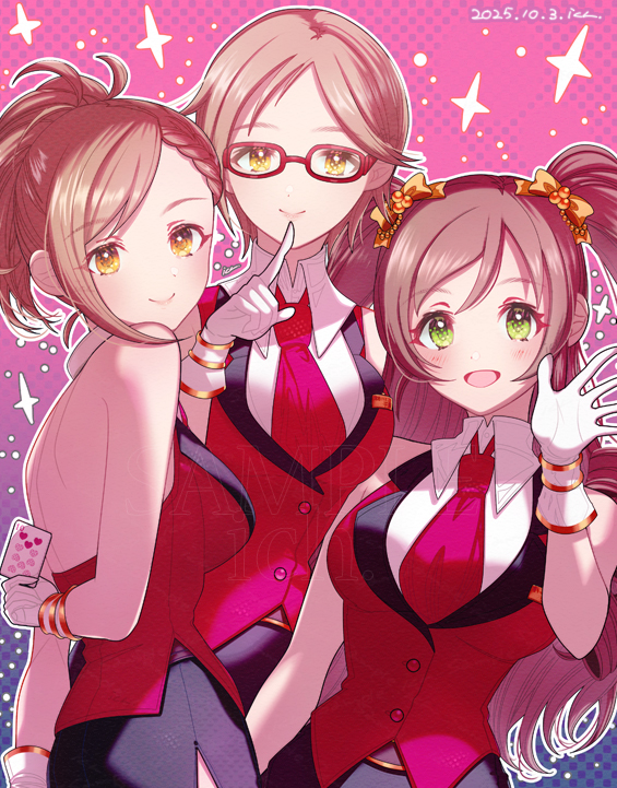 asterisk (asterism), saigusa haruka, little busters!, 1girl, blue eyes, bow, female focus, hair bobbles, hair ornament, hairclip, instrument, long hair, one eye closed, pink bow, pink hair, plaid clothes, plaid skirt, ponytail, purple hair, ribbon, school uniform, side ponytail, skirt, solo, star (symbol), striped clothes, striped thighhighs, tambourine, thighhighs, wink