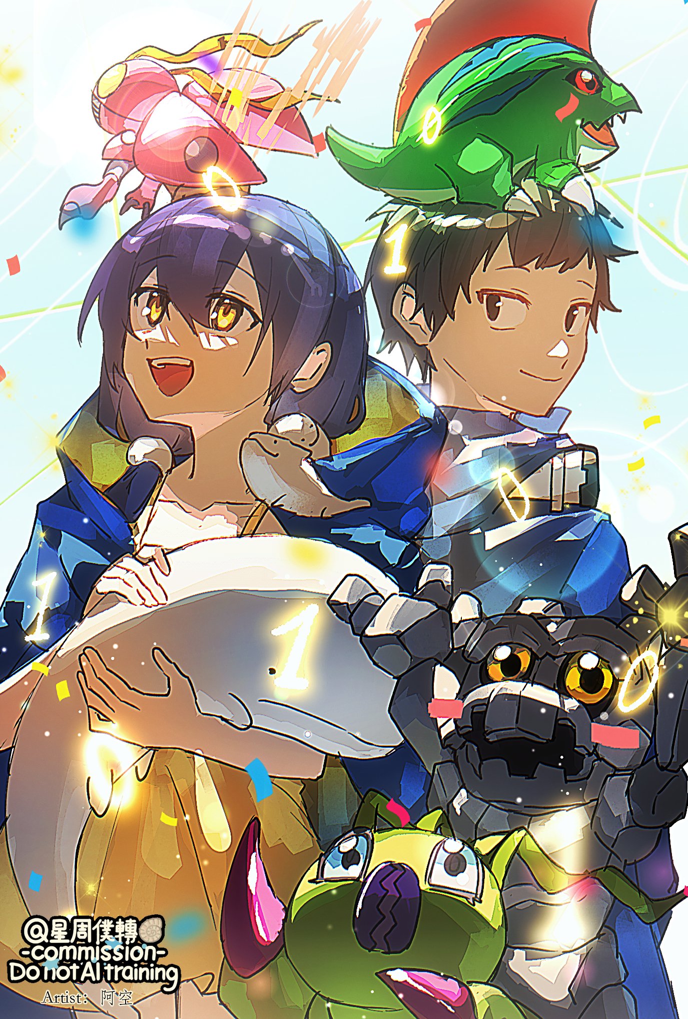 reku, rex (artist), schwertkreuz, yagami hayate, lyrical nanoha, mahou shoujo lyrical nanoha, mahou shoujo lyrical nanoha strikers, 00s, animal ears, blue eyes, brown hair, chibi, dual persona, hat, raccoon ears, raccoon tail, short hair, staff, tail, tanuki, unison (nanoha)