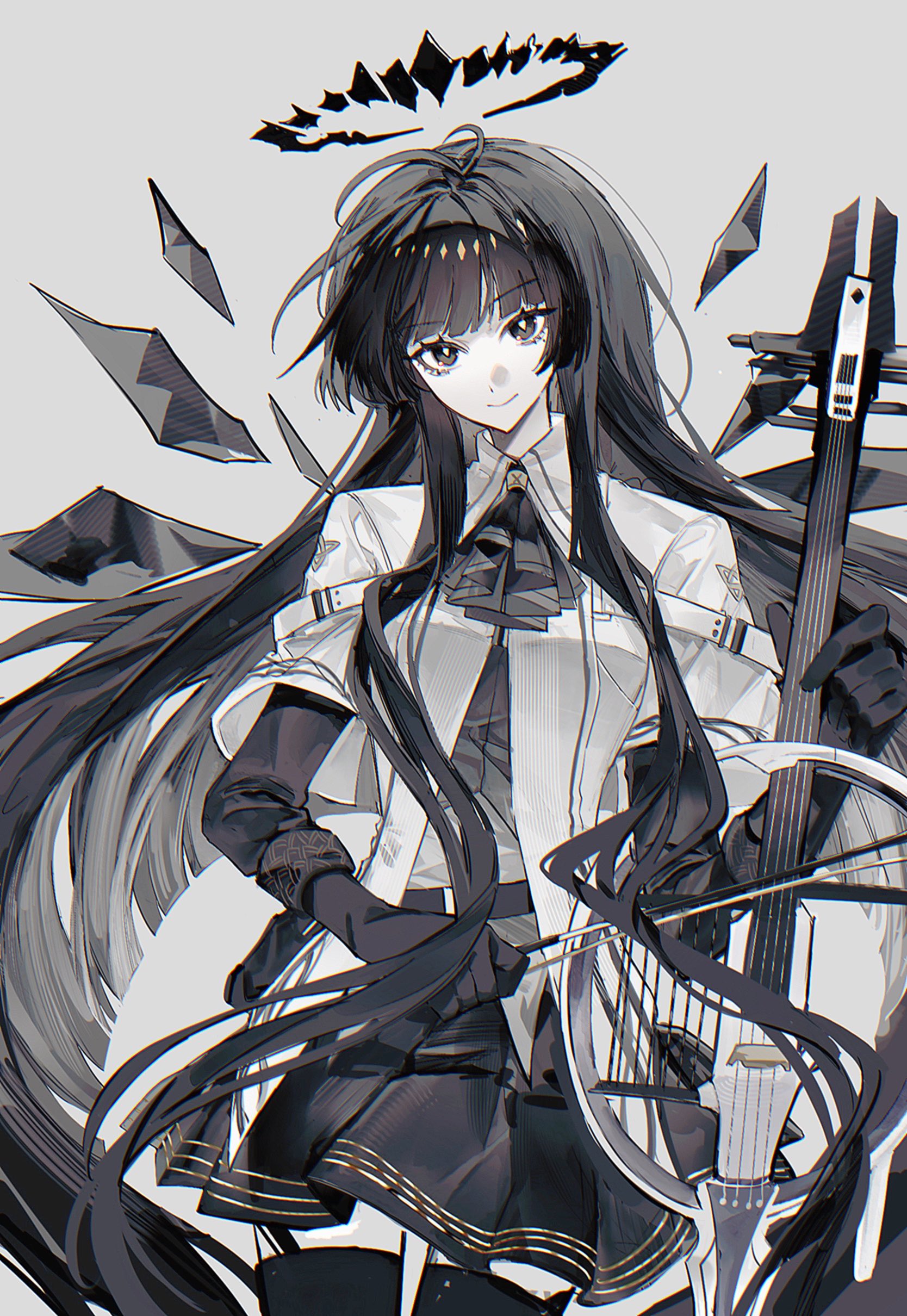 1girlascotblack ascotblack eyesblack glovesblack hairblack haloblack skirtblack thighhighsbow (music)bright pupilschromatic aberrationclosed mouthcollared shirtcowboy shotdark halodetached wingselbow glovesglovesgrey backgroundhaloholdingholding bow (music)holding instrumentinstrumentlong hairlooking at viewershirtsimple backgroundskirtsmilesolostandingthighhighswhite pupilswhite shirtwings