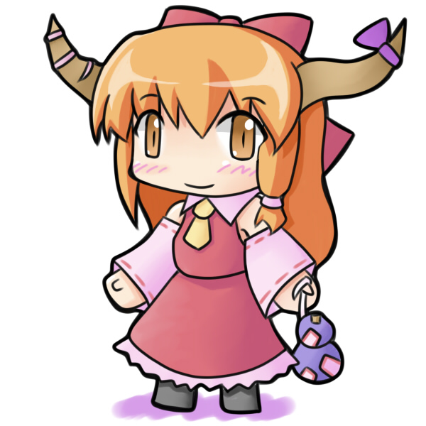 1girlchibicosplaydetached sleevesfemale focusfull bodyhakurei reimu (cosplay)hornsjapanese clothesmikoorange hairsolowhite background