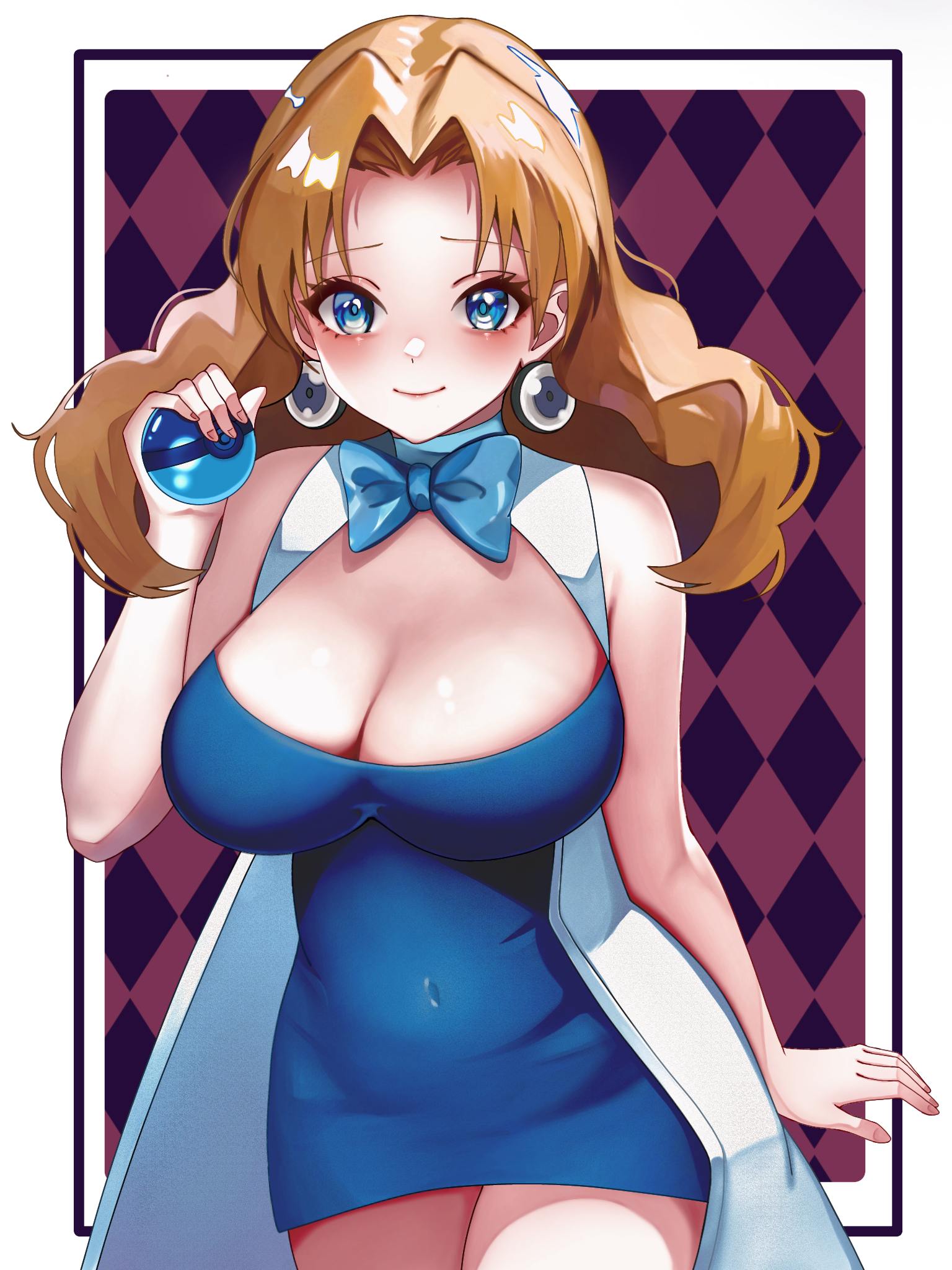 1girlaged upalternate breast size (larger)blue bowblue bowtieblue dressblushbowbowtiebreastsbrown haircleavagedressearringsholdingholding poke balljewelrylarge breastsmedium hairnontraditional poke ballpoke ballsmilesolo