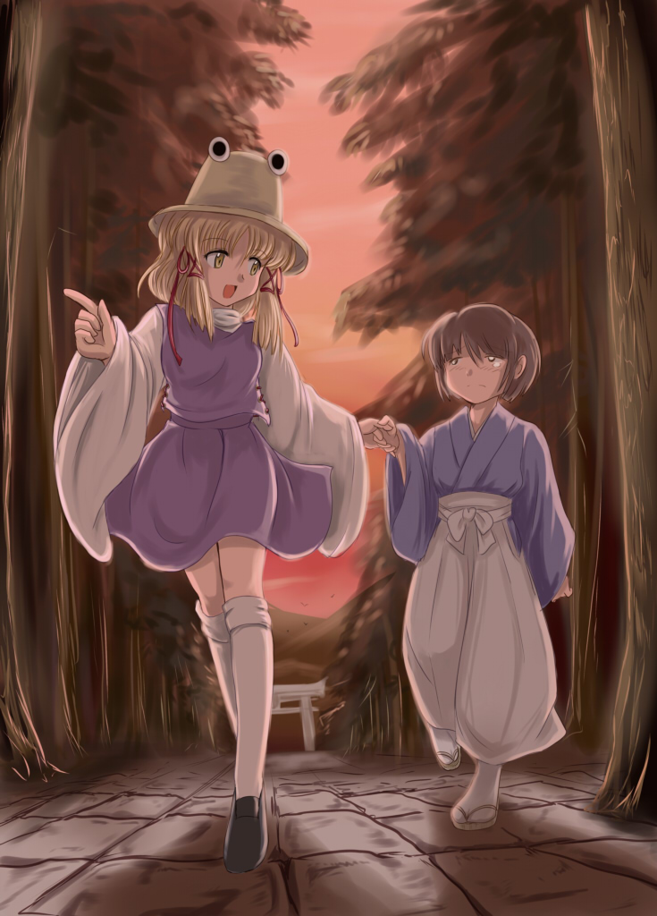 2girlsblonde hairbrown hairfemale focusforestfull bodyhatjapanese clotheskneehighsmultiple girlsnatureoutdoorsplantshort hairskirtskysockssunsettearsthighhighsyellow eyes