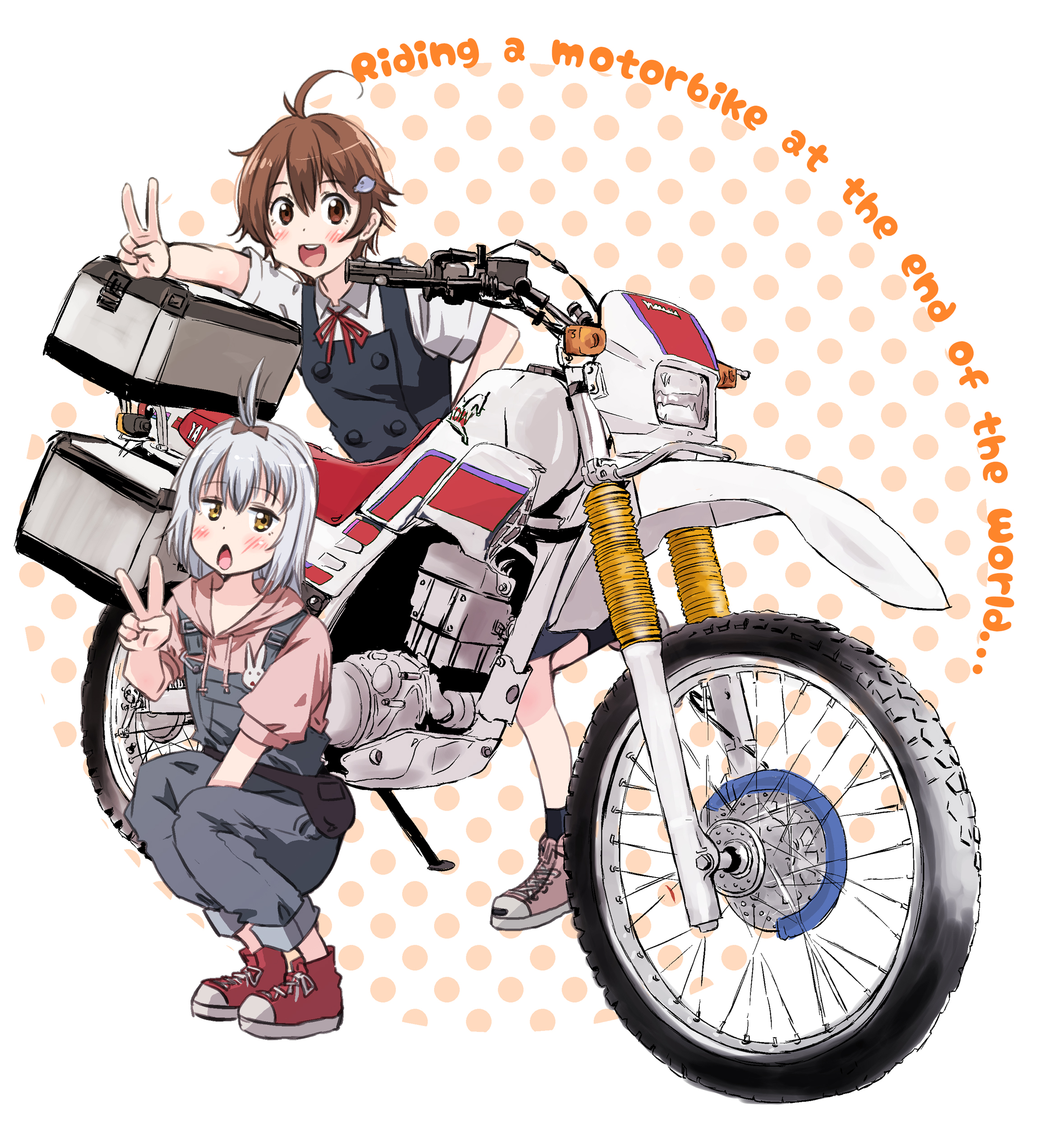 2girlsahogeanimal hair ornamentblack vestbrown eyesbrown haircollared shirtcopyright namehoodhood downhoodiehuge ahogelooking at viewermotor vehiclemotorcyclemultiple girlsneck ribbonoverallspink hoodiered ribbonribbonshirtsquattingteethupper teeth onlyvvestwhite hairwhite shirtyellow eyes