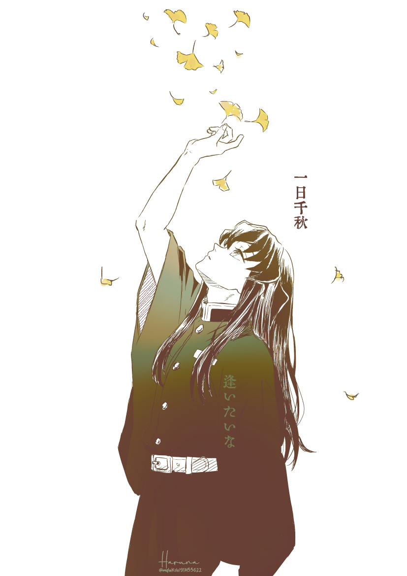 1boyarm upartist namebeltclosed mouthcowboy shotdemon slayer uniformexpressionlessfrom sideharuna (runa27)japanese clotheslong hairlooking upmale focuspale colorsidelockssimple backgroundsolotwitter usernamewhite backgroundwide sleeves