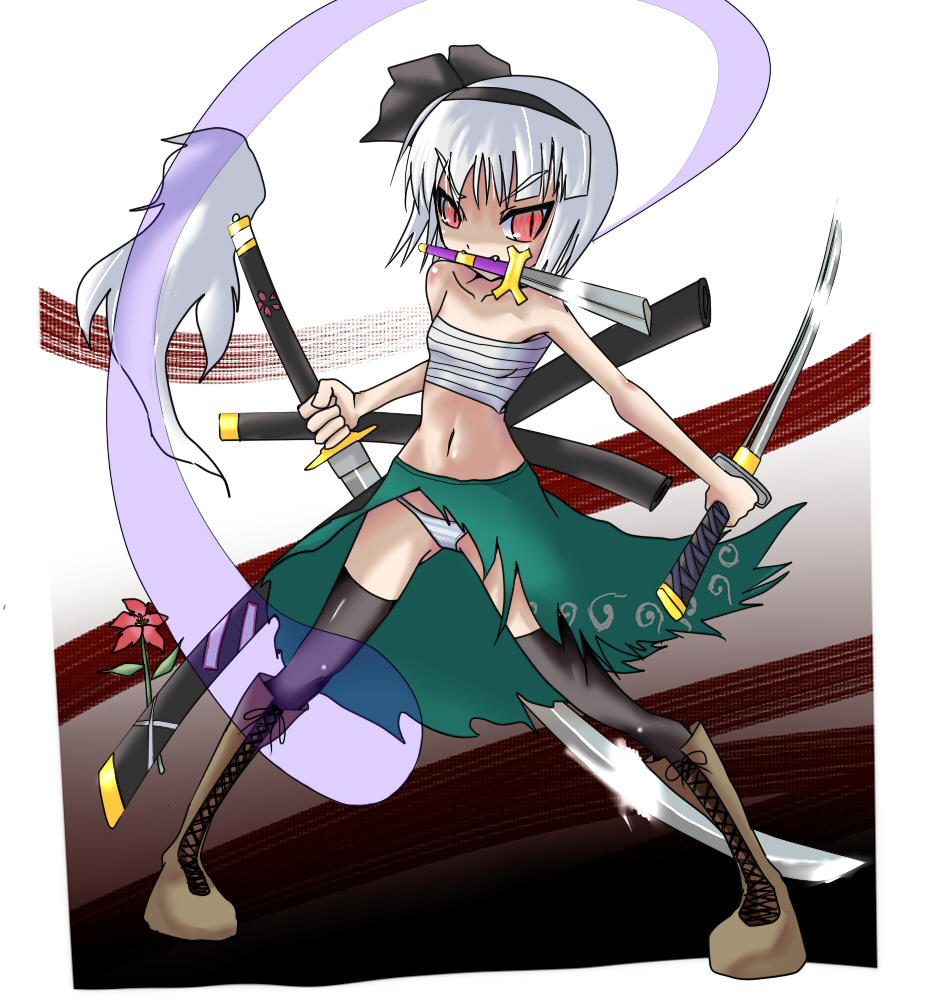 1girlbandageschest sarashicrazy eyesdual wieldingfemale focusghosthairbandhitodamaholdingkatanamouth holdno shirtpantiesparodysarashiscabbardsheathshort hairsolostand (jojo)striped clothesstriped pantiesswordtantothighhighstorn clothestriple wieldingunderwearweapon