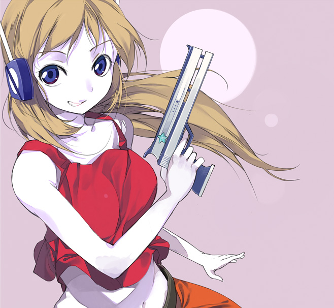 1girlandroidblonde hairblue eyesfemale focusgringunmidriffnavelpale skinrobot earssimple backgroundsmilesolostar (symbol)tank topweapon