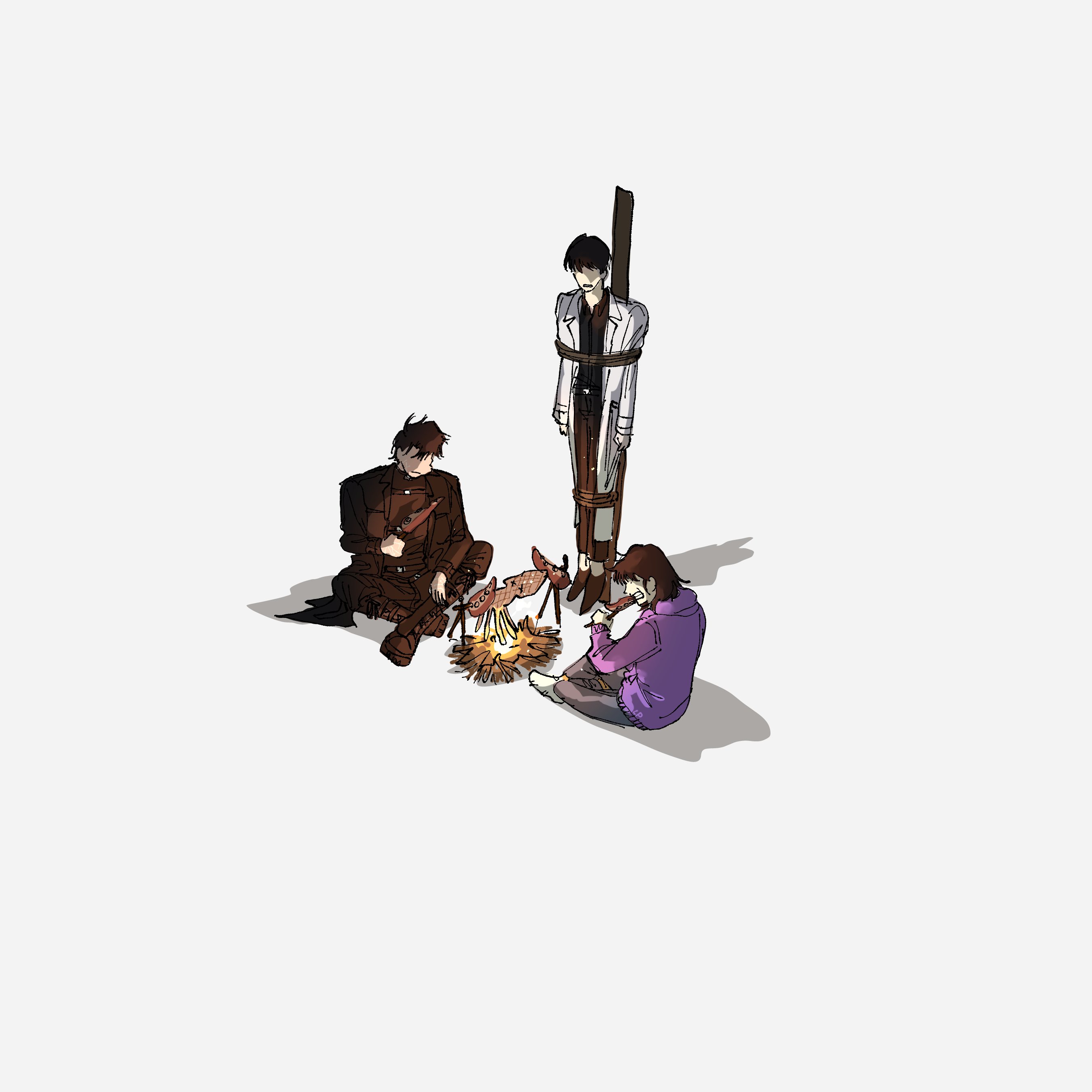 1girl2boysblack coatblack hairboundcampfirecoatcrossed ankleseatingfull bodyholdingholding skewerhoodhood downhoodiemultiple boysno eyesopen clothesopen coatpurple hoodierotisserieshort hairsittingskewersquidstaketied up (nonsexual)white coat