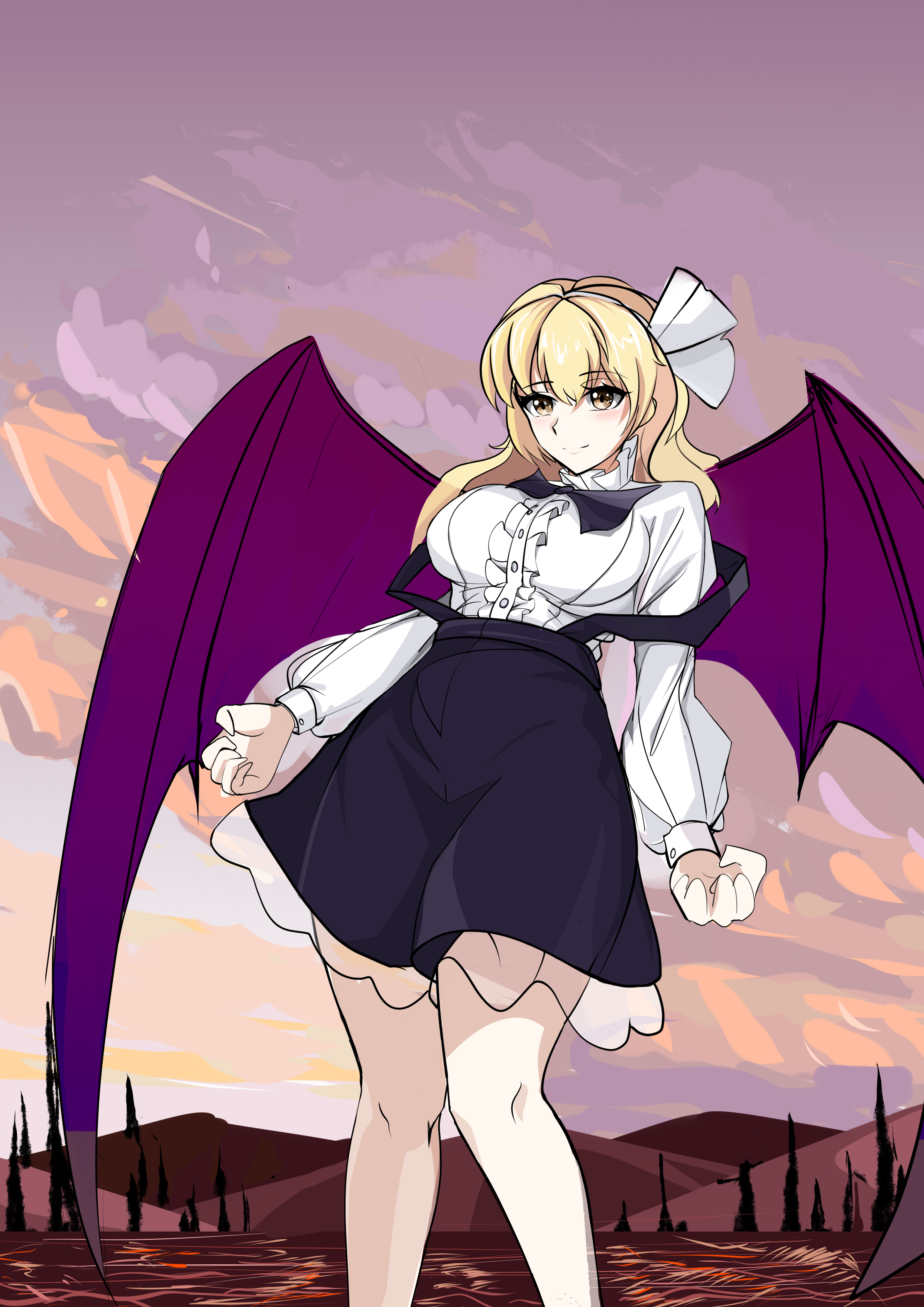 1girlbat wingsblack skirtblonde hairbloodbowbreastsclosed mouthcowboy shotcrossed bangscurled fingersdress shirtfrilled skirtfrillshair bowhilllakelarge breastslong hairlong sleeveslooking at viewerorange cloudspurple skyshirtshoulder strapskirtskysmilesolosplit mouthsuspender skirtsuspendersvampirewhite bowwhite shirtwingsyellow eyes