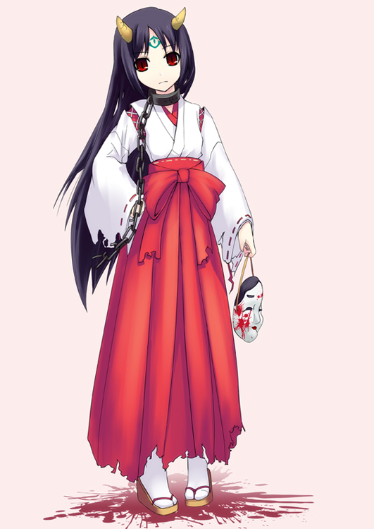 black hairbloodchaincollardemon girleye tattoohornsjapanese clotheslong hairmaskmikoonired eyestattootorn clothes
