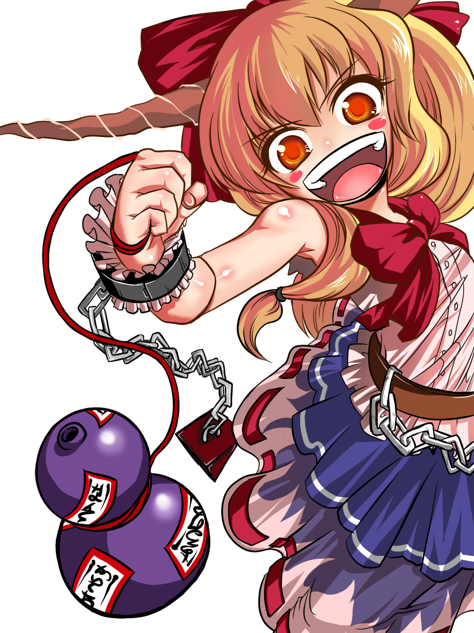 1girlblonde hairbowchainfemale focusgourdhair bowhornslong hairopen mouthsimple backgroundsoloyellow eyes