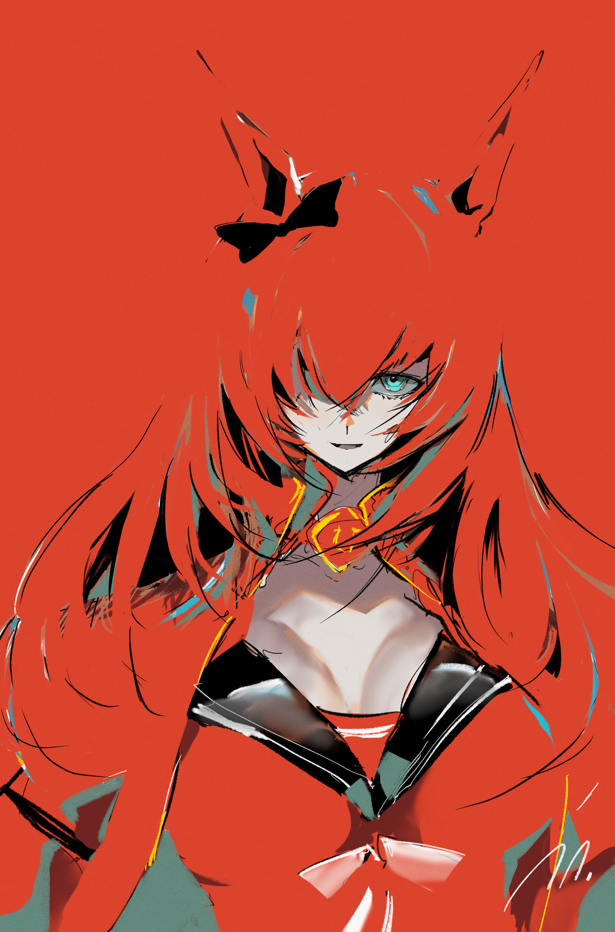 1girlanimal earsaqua eyesartist nameblack bowblack sailor collarblendingbowbreastscleavageear bowhair over one eyehorse earshorse girllarge breastslight smilelong hairlooking at vieweropen mouthred backgroundred hairred shirtsailor collarshirtsignaturesimple backgroundsolostraight-onupper bodywhite bow