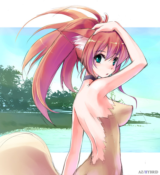1girlanimal earsbreastschokerfemale focusfoxfox earsfox tailgreen eyeslarge breastslooking backnudered hairsolotail