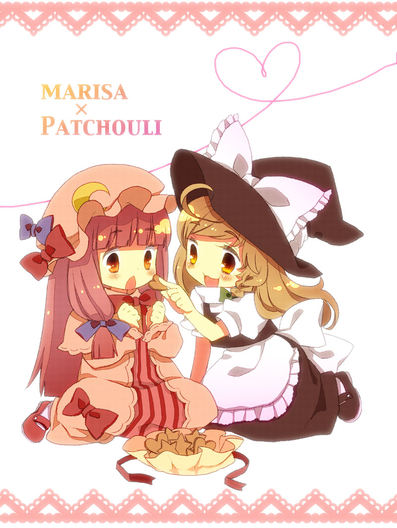 2girlsblonde hairbraidcookiedressfemale focusfoodfull bodyhatlong hairmultiple girlspurple hairshort hairside braidskirtwhite backgroundwitchwitch hatyellow eyes
