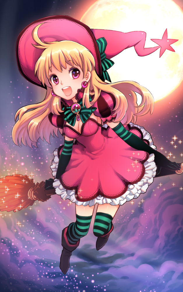 1girlblonde hairbootsbroombroom ridingelbow glovesfemale focusfull moongloveshatlight particlesmoonnightnight skyopen mouthpink eyesribbonsidesaddleskysolosparklestriped clothesstriped thighhighsthighhighswitchwitch hat