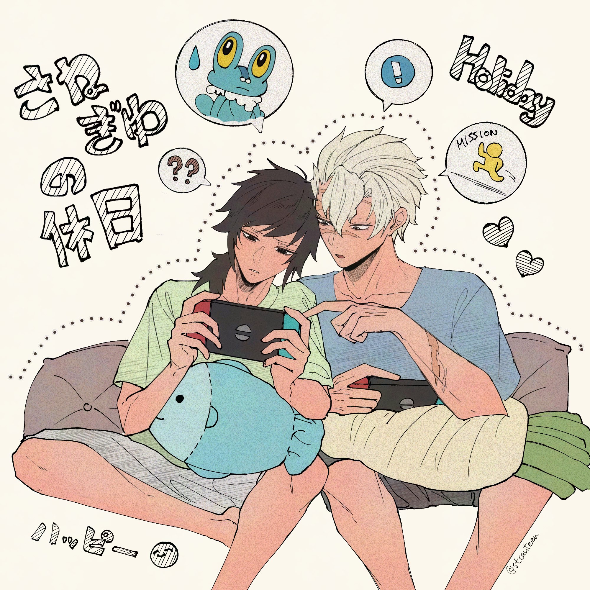1boy2boysblue shirtempty eyesenglish textfroggen 6 pokemongreen shirtgrey hairhandheld game consoleholdingholding handheld game consolelong hairlow ponytailmale focusmultiple boysnintendo switchparted lipspokemon (creature)ponytailpurple eyesshirtshort hairsimple backgroundsittingspiked hairspoken exclamation markspoken question markstcanteenteethwhite background