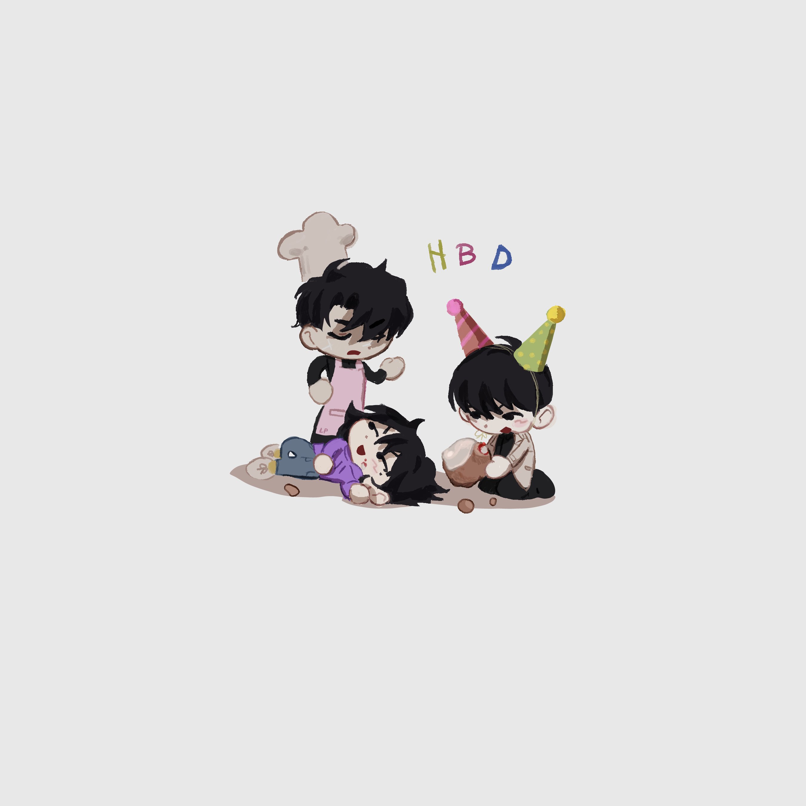 :d1girl2boysapronblack hairblack shirtchef hatchibichibi onlycoatcurtained hairfoodfood on facefull bodygrey coathand on own hiphappy birthdayhathoodhoodielyingmultiple boysmultiple hatson backon groundopen mouthpartially shaded faceparty hatpink apronpurple hoodiescoldingseizashirtshort hairsittingsmilestanding