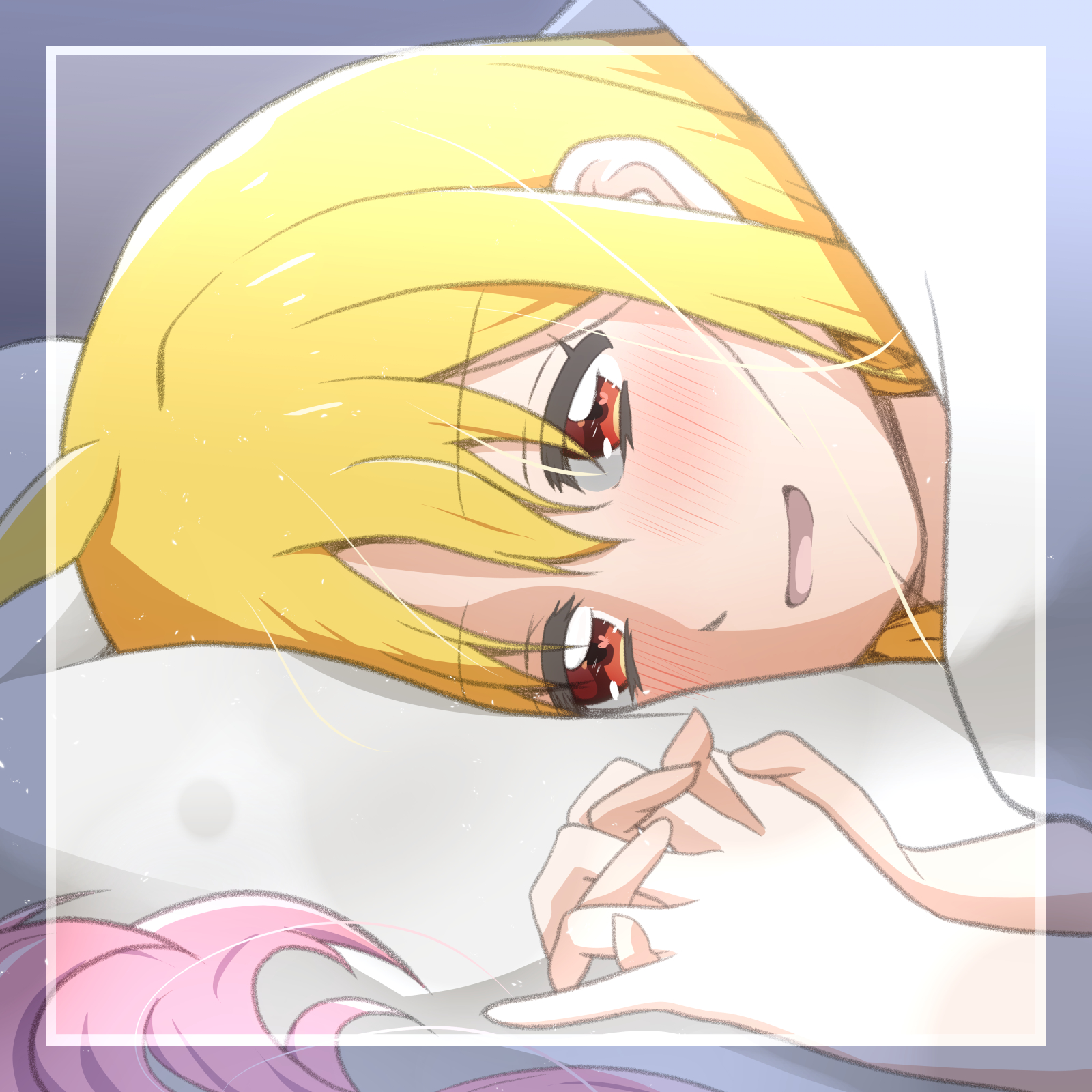2girlsahogeblonde hairblushhair downholding handsinterlocked fingerslong hairmultiple girlsparted lipspink hairred eyessmilesolo focusunder coversyuri