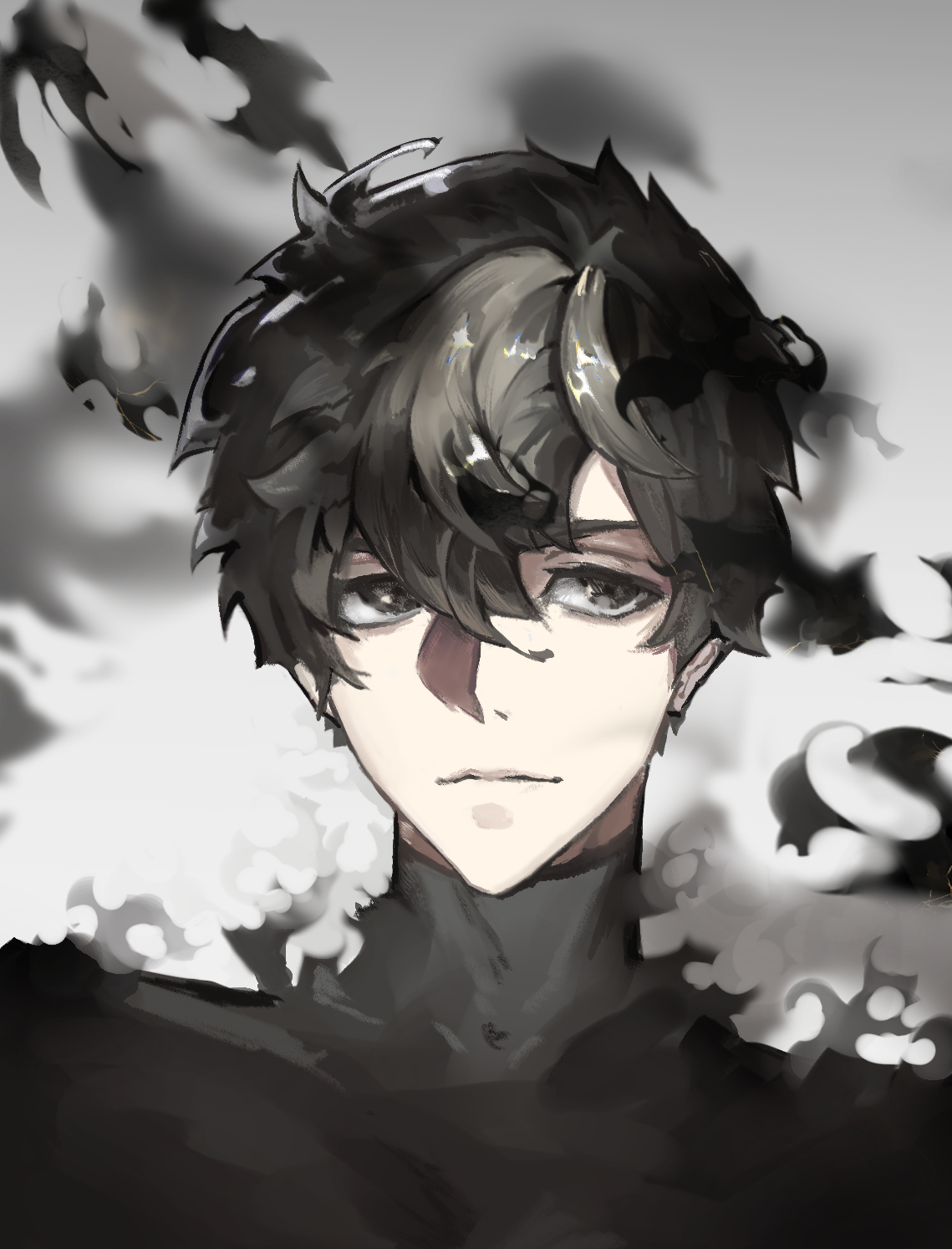 1boyblack eyesblack hairblack shirtcrew neckexpressionlesshair between eyeslooking to the sidemale focusportraitshirtshort hairsmokesolo