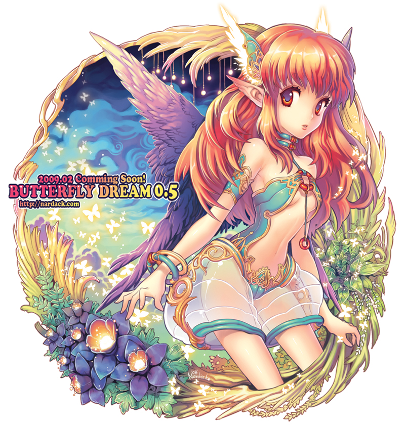 1girlbreastsbugbutterflyelffemale focusflowerhead wingsinsectlong hairnavelpointy earsred hairsmall breastssolounderboobwings