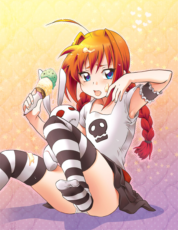 00s1girlahogearm garterblue eyesbraidfemale focusfoodice creamno shoespantiesrabbitred hairsexually suggestiveshirtskirtsolostriped clothesstriped thighhighsstuffed animalstuffed rabbitstuffed toyt-shirtthighhighstwin braidsunderwear