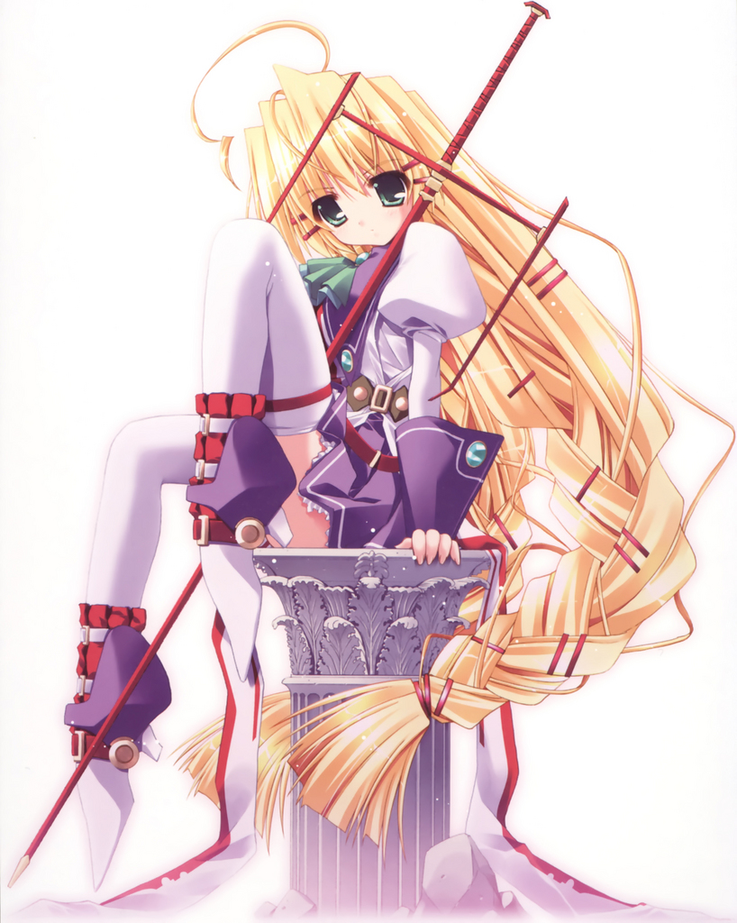 00s1girlahogearmorblonde hairblousebraidfemale focusfrom sidefull bodygreavesgreen eyeshead tilthuge weaponlong hairminiskirtpelvic curtainpillarschool uniformserafukusheathsheathedshirtsimple backgroundsittingskirtsolostaffthigh strapthighhighstwin braidsvery long hairweaponwhite backgroundwhite shirtwhite thighhighs