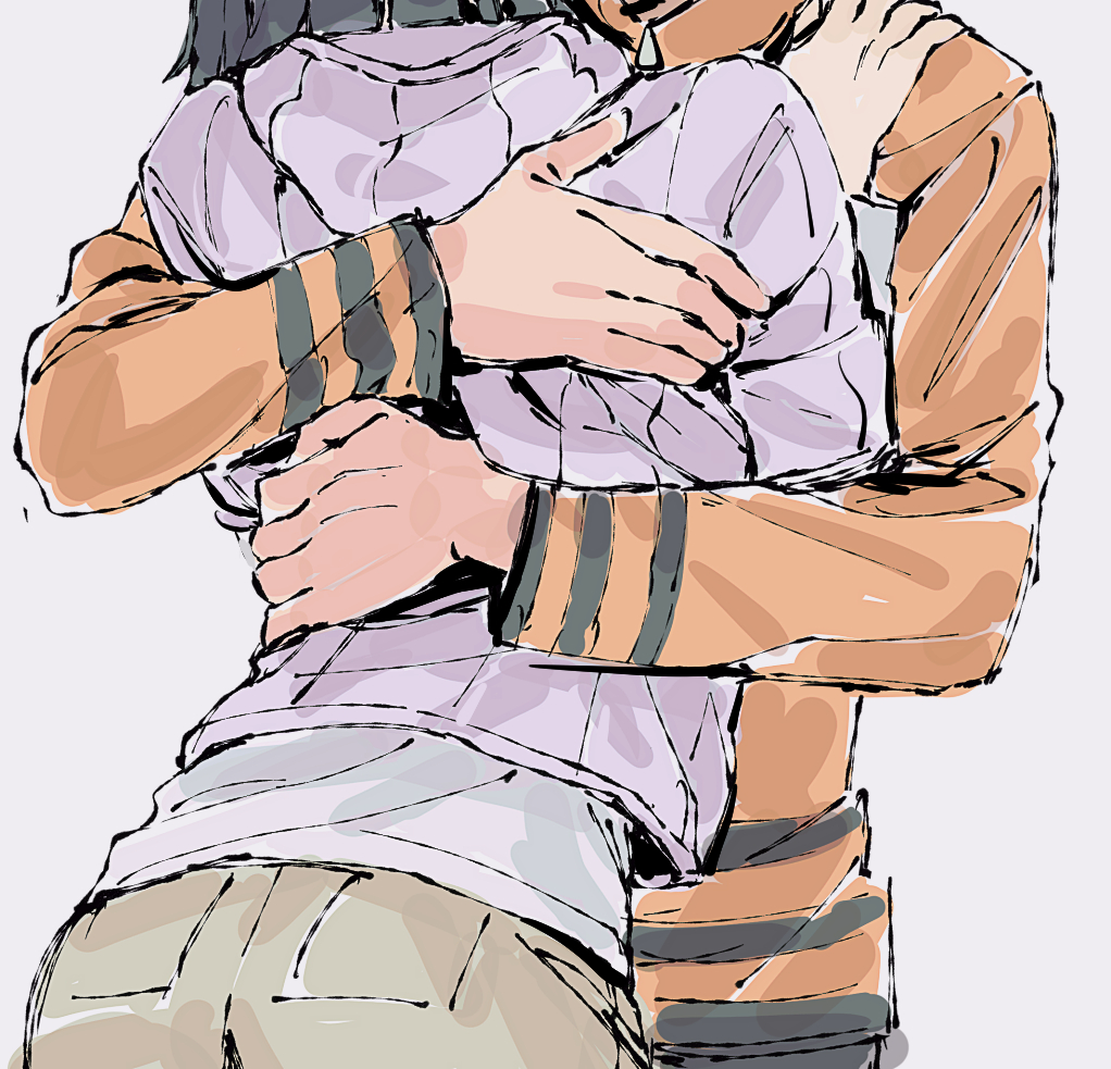 1boy1girlcouplecowboy shothead out of framehughusband and wifeorange shirtpurple shirtshirtsimple backgroundwhite background