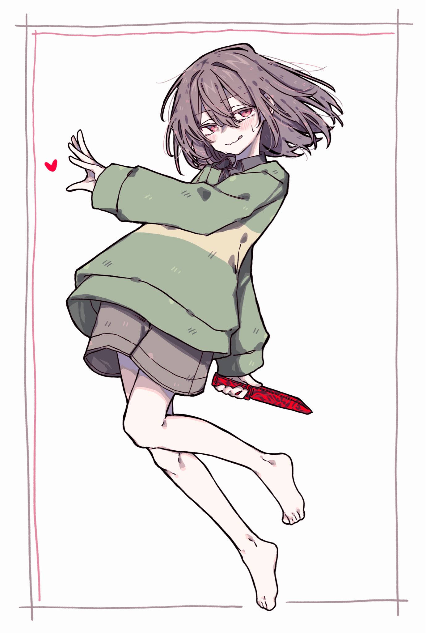 1otherbarefootblushbrown hairbrown shortsclosed mouthfull bodygreen sweaterheartlooking at viewermedium hairokura 0915other focusred eyesshortssmilesolosweatdropsweatertonguetongue outwhite background