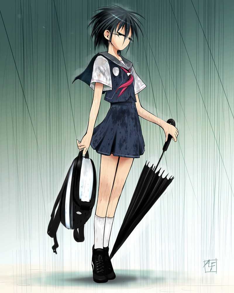 1girlbackpackbagblack hairclosed umbrellafemale focusglassespleated skirtrainrandoseruschoolschool uniformshort hairskirtsockssoloumbrella