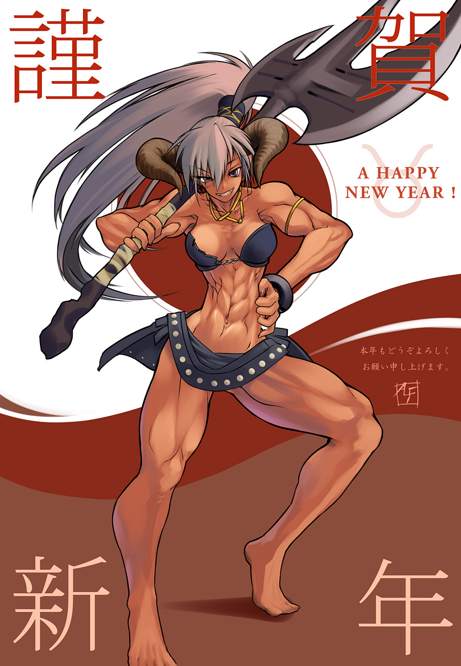 1girlaxebarefootbreastsdark skindark-skinned femalefeetfemale focushornslarge breastslong hairminotaurmuscularmuscular femaleno pantiesponytailpterugespurple eyessmilesolowarriorweaponwhite hair