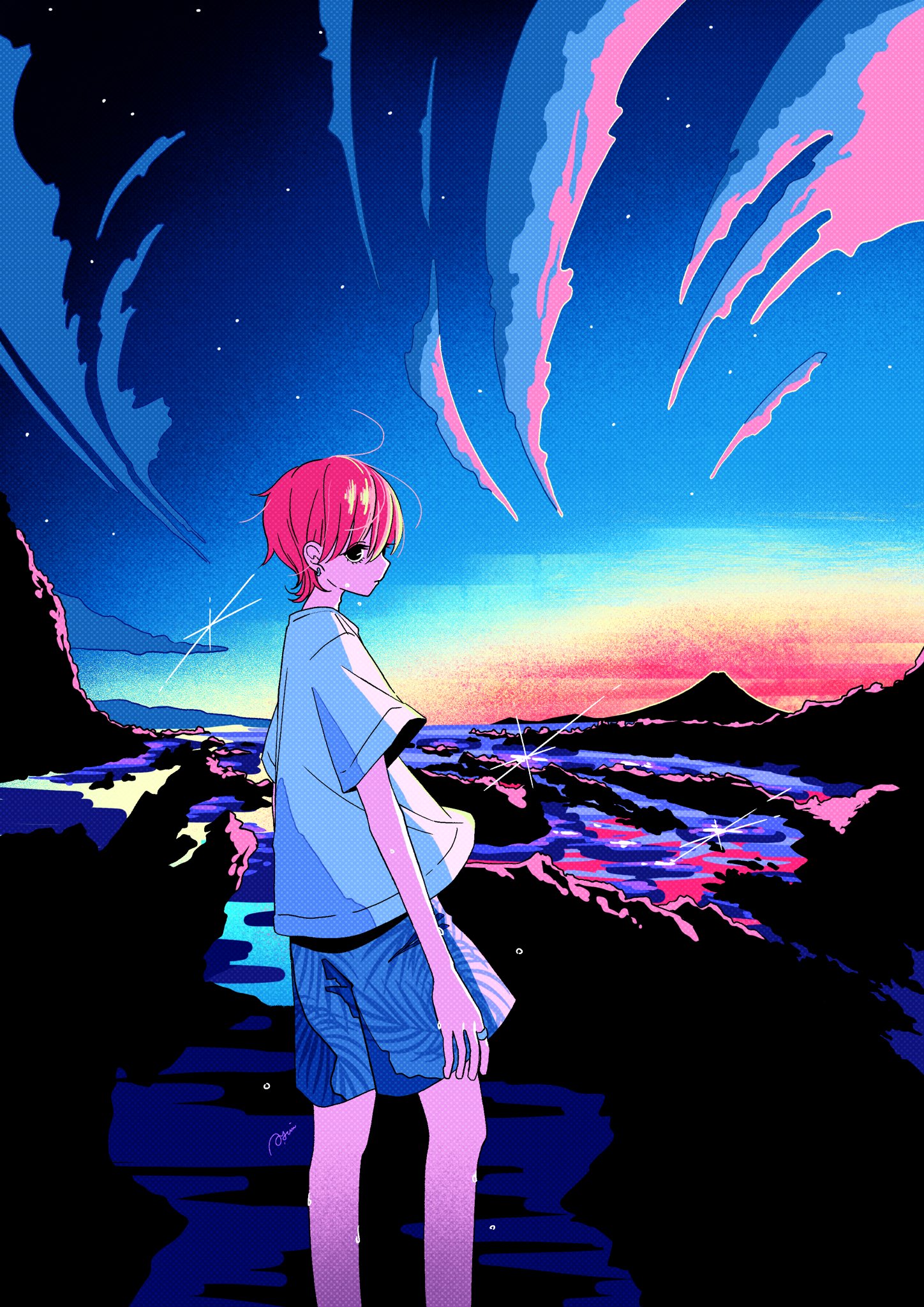 1girlblack eyesblue shortscloudgradient skyhair between eyeshorizonlooking at viewerlooking backloose hair strandoutdoorspink hairprint shortssceneryshirtshort hairshort sleevesshortsskysolostar (sky)white shirt