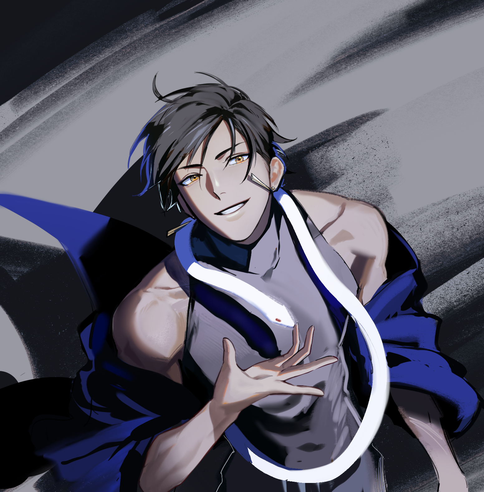 1boyblack haircollarboneearringsfrom abovegrey shirtjewelrylooking at viewermale focusorange eyesparted lipsshirtshort hairsleevelesssleeveless shirtsnakesnake wrapped around necksoloupper bodywhite snake