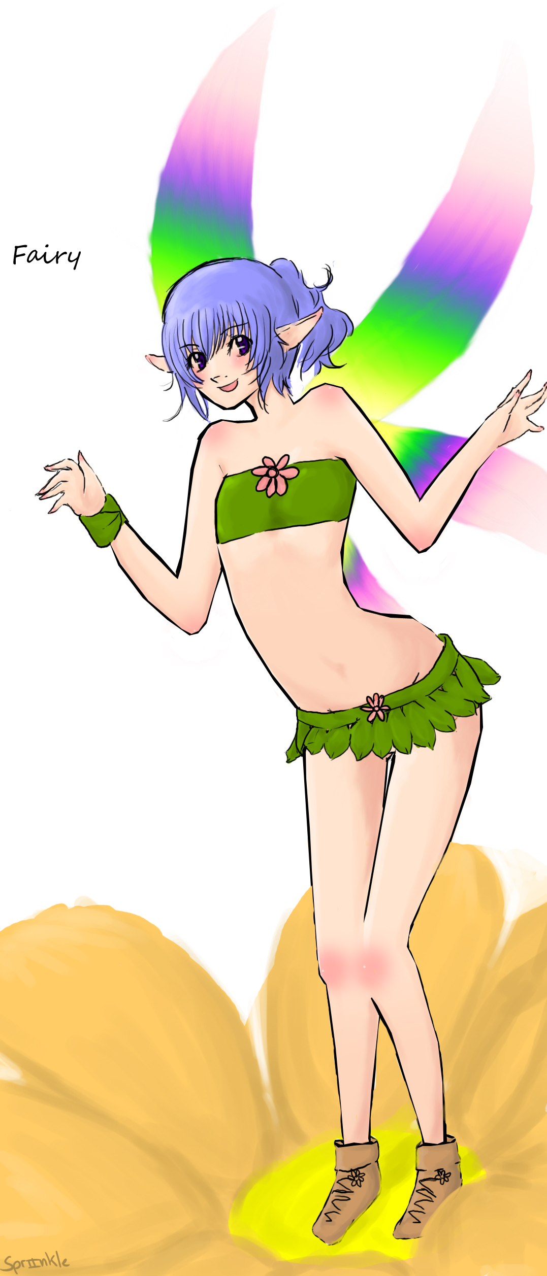 1girlblue eyesblue hairfairyfemale focusflat chestflowermatching hair/eyesmidriffpointy earsponytailskirtsolostraplesstube topwings