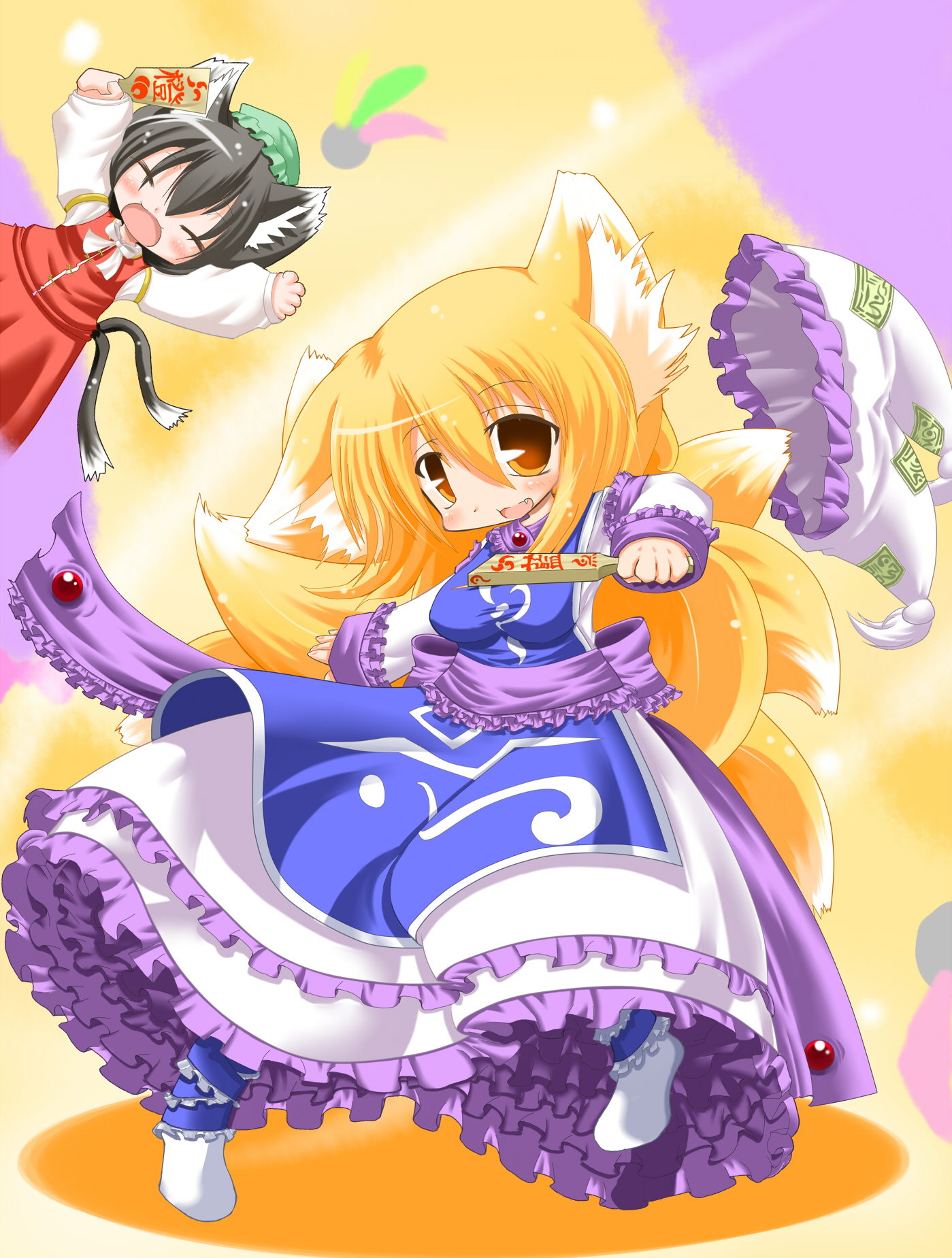 2girlsanimal earsanimal hatblonde hairbrown haircat earscat girlcat tailclosed eyesdressfangfemale focusfox earsfox tailfrilled dressfrillshatkitsunekyuubilong sleevesmob capmultiple girlsmultiple tailsorange eyesshort hairtailtasselunworn hatunworn headwearyellow eyes