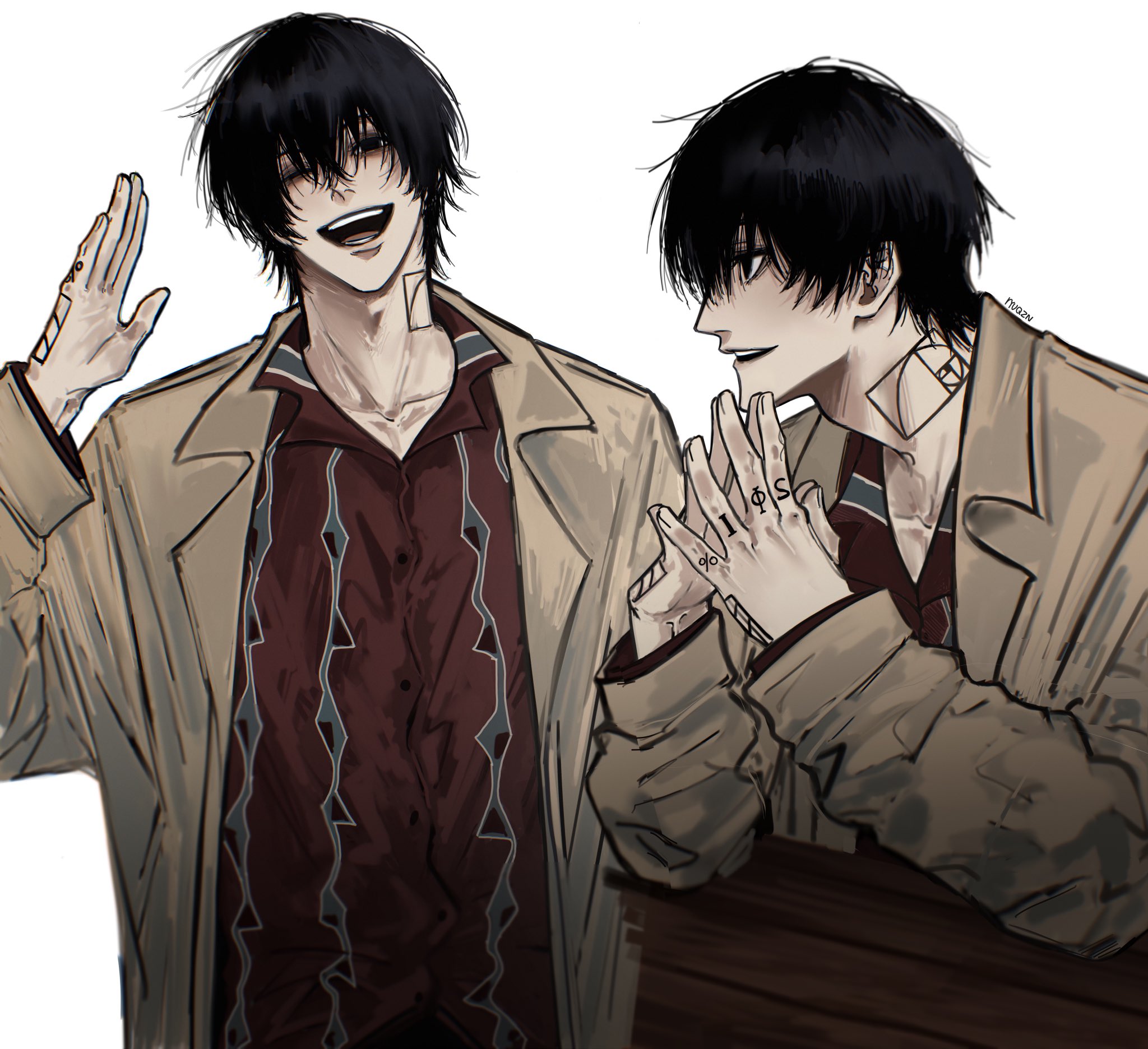 1boyartist nameblack eyesblack hairfibonacci sequence tattoofinger tattoohair between eyeshand tattoolong sleevesmale focusmultiple viewsneck tattooone eye closedopen mouthryuqznshort hairsimple backgroundsmiletattooteethupper teeth onlywhite background