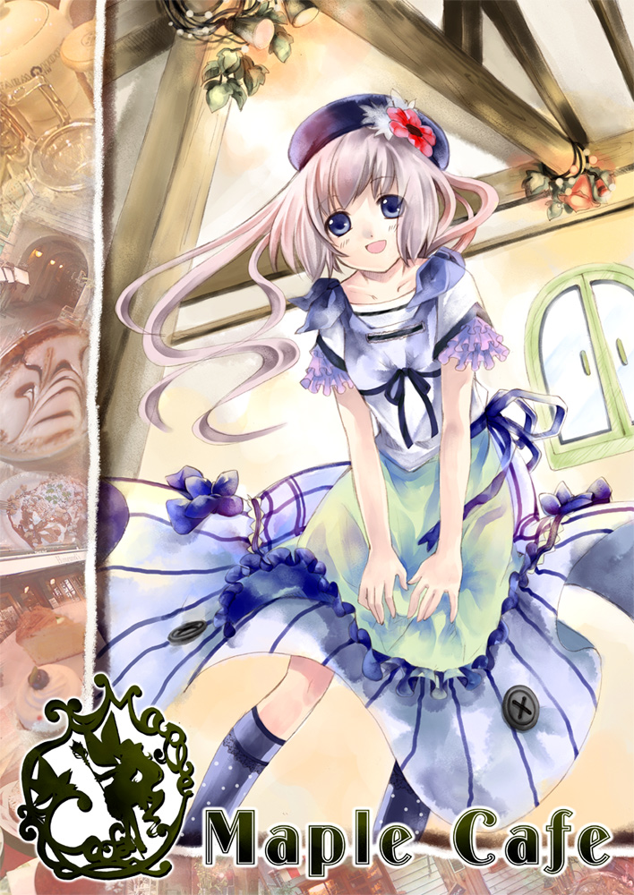 eimu, furude rika, houjou satoko, higurashi no naku koro ni, 00s, 2girls, animal ears, apron, blonde hair, blue hair, bonnet, bow, cat ears, cat tail, fang, frills, hair bow, hairband, maid, maid apron, multiple girls, one eye closed, pink bow, purple eyes, tail, thighhighs, twintails, wink