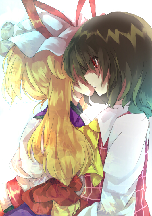 2girlsascotblonde hairfemale focusgreen hairlong hairmultiple girlsplaid clothesplaid vestred eyesshaded faceshort hairvest