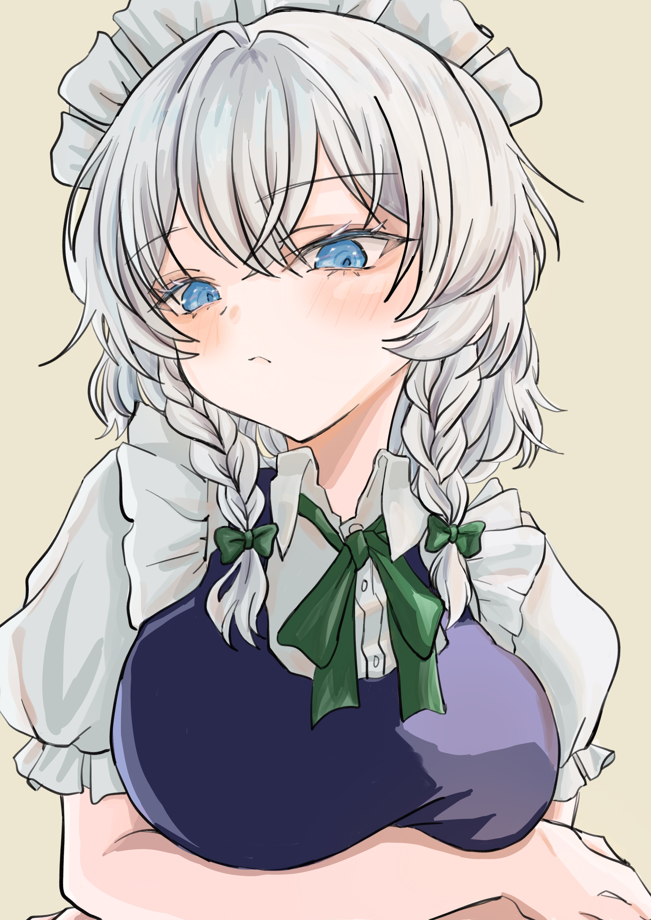 1girlarm under breastsblue dressblue eyesblushbowbraidbraided sidelockbreastsdressfrilled sleevesfrillsgreen bowgreen ribbongrey hairhair bowlooking downmaid headdressmedium breastsneck ribbonpuffy short sleevespuffy sleevesribbonshirtshort sleevessimple backgroundsoloteethtwin braidsupper bodyupper teeth onlywhite shirt