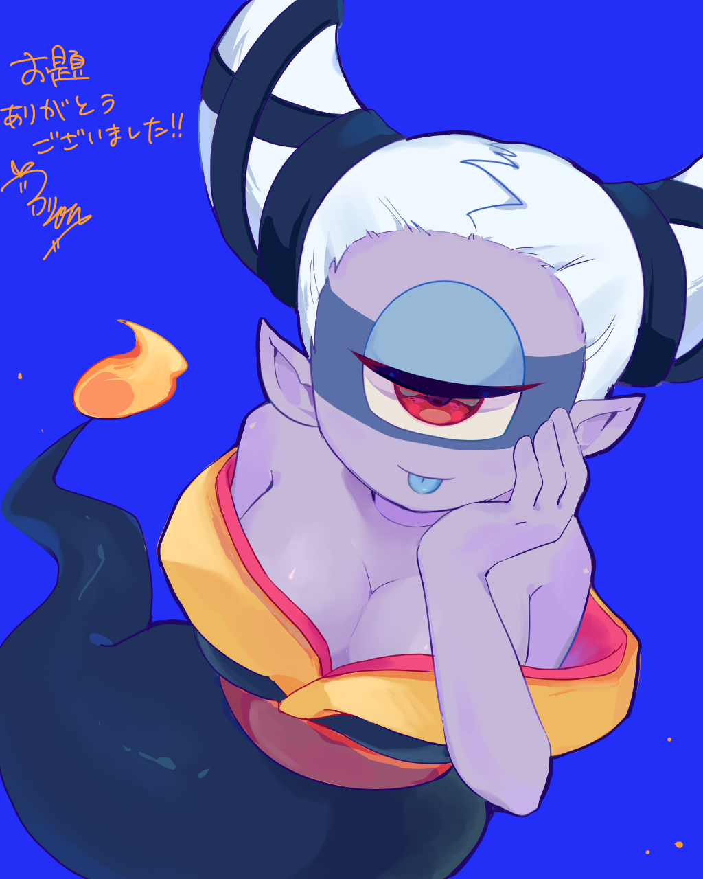 1girlbare shouldersblack ribbonblue eyeshadowblue tonguebreastscleavageclosed mouthcolored skincolored tonguecyclopseyeshadowfrom abovefull bodyhair behind earhair hornshair ribbonhand on own cheekhand on own facehand upjitomelooking at viewermakeupmedium breastsmonster girlone-eyedpointy earspurple skinred eyesribbonshort hairsmilesolotonguetongue outwhite hair