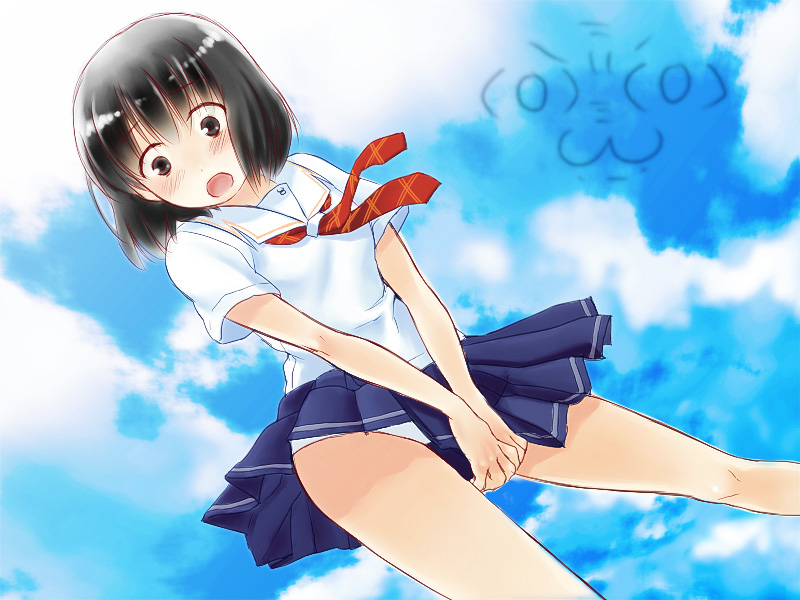 1girlblack eyesblack hairblushdayfemale focuspantiespantyshotschool uniformshort hairskysolounderwearwindwind lift