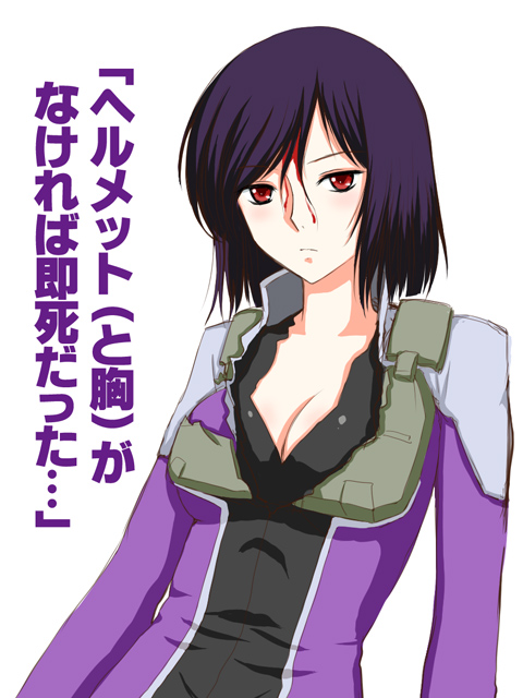 00s1girlbloodbodysuitbreastscleavagefemale focusgenderswapgenderswap (mtf)medium breastspurple bodysuitpurple hairred eyesshort hairsolo
