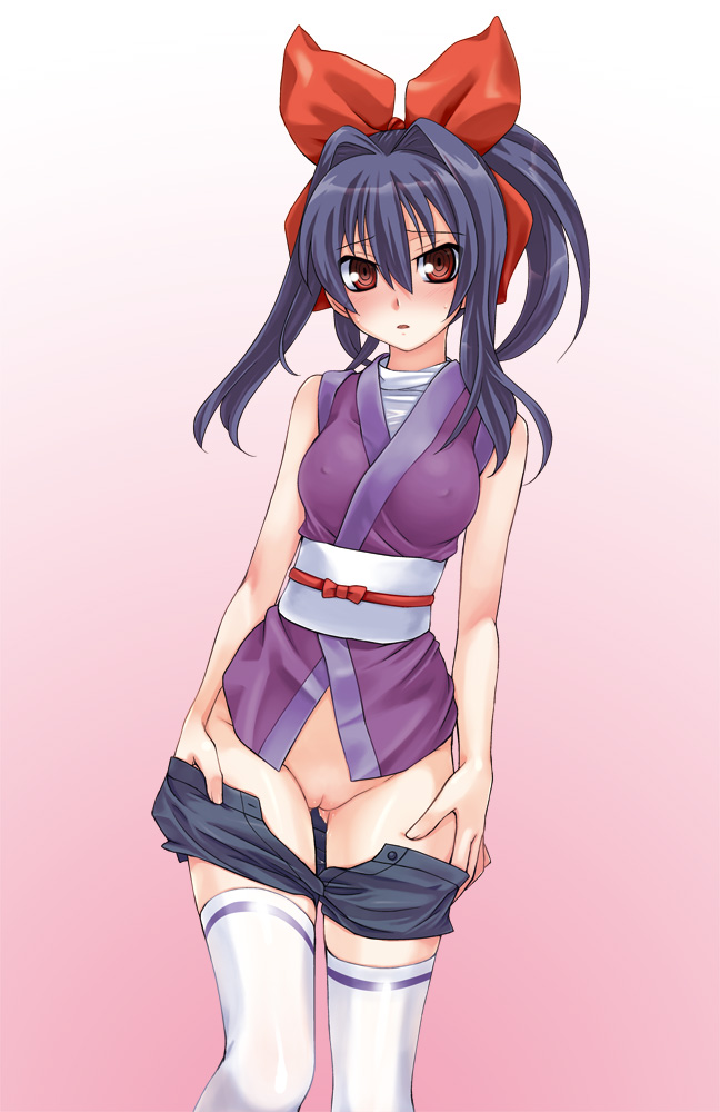 1girlblue hairblushbreastsbrown eyesclothes pullcovered erect nipplesfemale focushair ribbonjapanese clothesmedium breastsninjano pantiesopen clothesopen flyopen shortspulling own clothespussypussy juiceribbonshortsshorts pullsleevelesssolosweatthighhighsuncensoredundressingunzippedwhite thighhighs