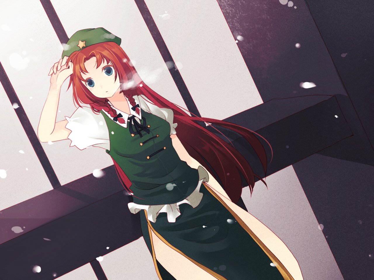 1girlblue eyesbraidbreathchinese clothescolored eyelashesdutch angleeyelashesfemale focushatlong hairred hairribbonshort sleevesside slitsnowsolotwin braidswinter