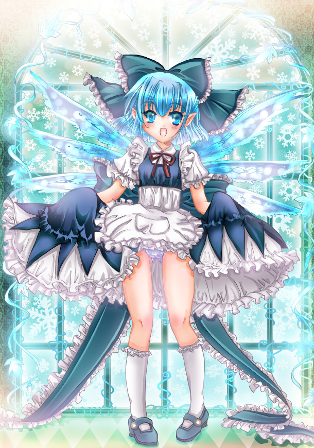 1girlalternate costumeblue hairclothes liftenmaidedfemale focushair ribbonmaidpantiespantyshotpointy earsribbonskirtskirt liftsolounderwearupskirtwings