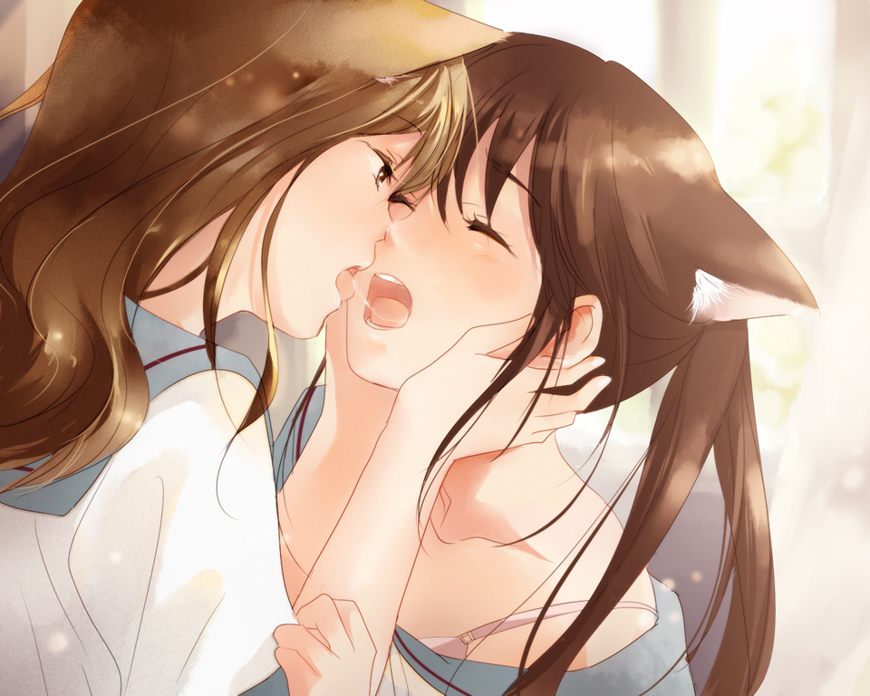 animal ears, blonde hair, blue hair, bow, cat ears, hand fan, japanese clothes, kimono, kneehighs, leg warmers, long hair, miko, red eyes, socks, tabi, white hair