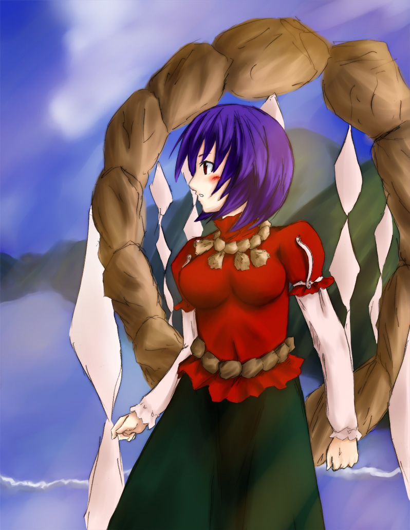1girlblushbreastscloudfemale focusoutdoorspurple hairred eyesropeshideshimenawashort hairsketchskysolostandingwater